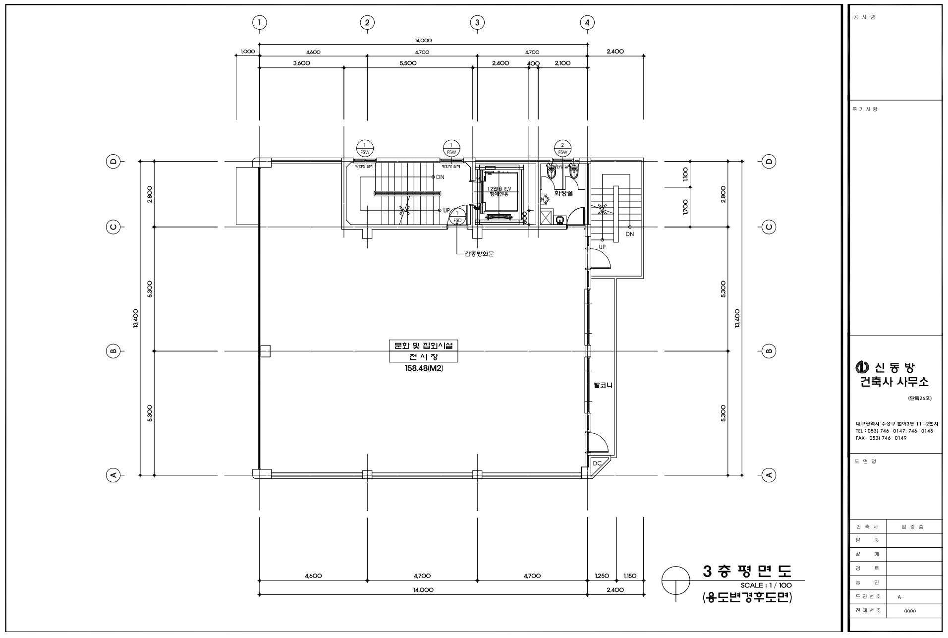 | 3층 | 제1전시실 | 158㎡ | 3,000,000원 | - 작품 부착면 천정 높이 2.6m - 기본 조명(이동식 할로겐 50w) - 간접조명(삼파장 형광등) |